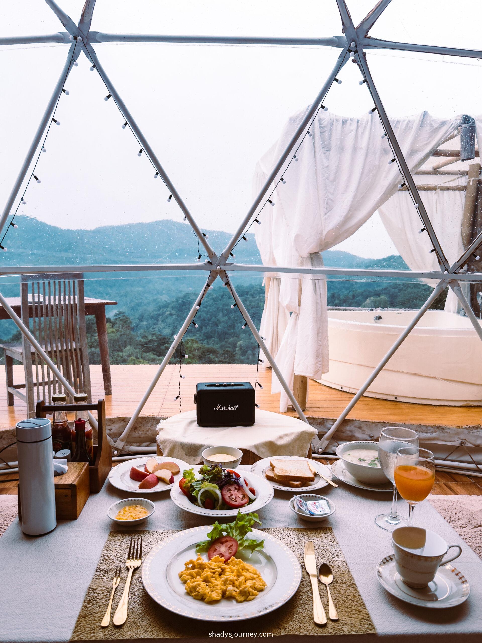 Driving higher and higher into the clouds, the air turned cooler and crisp. When I finally stepped out, it felt like stepping into another world. The glamping domes dotted the hilltop, glowing softly as the fog curled around them.